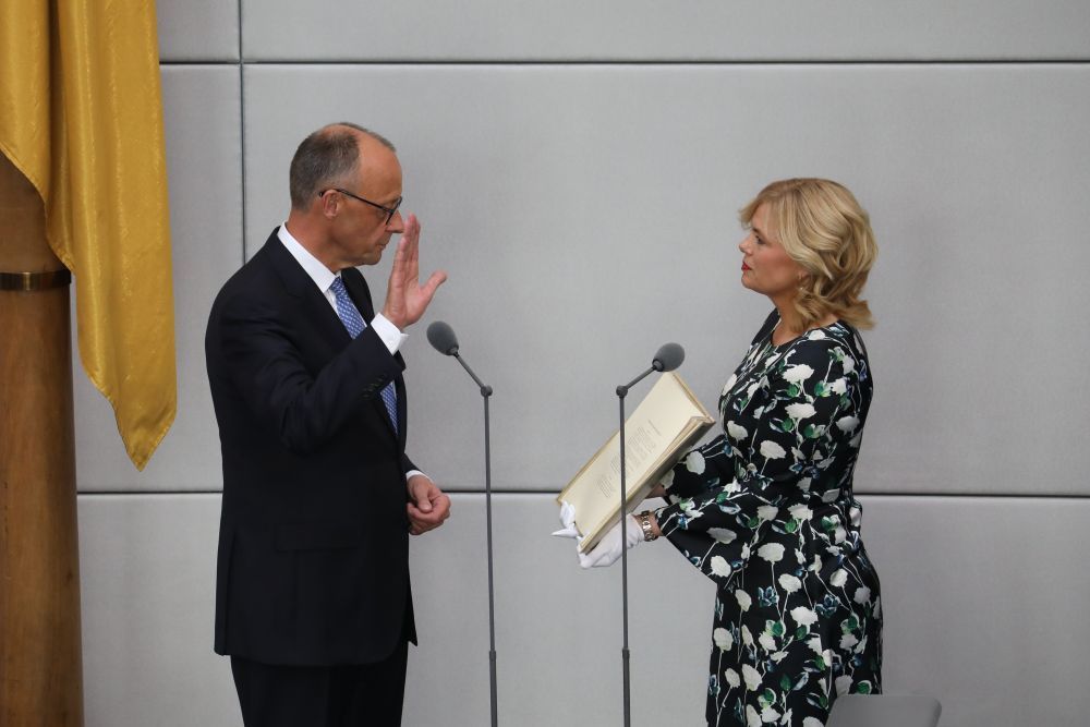 5月6日,在德国首都柏林的国会大厦,默茨(左)宣誓就职。新华社记者杜哲宇摄