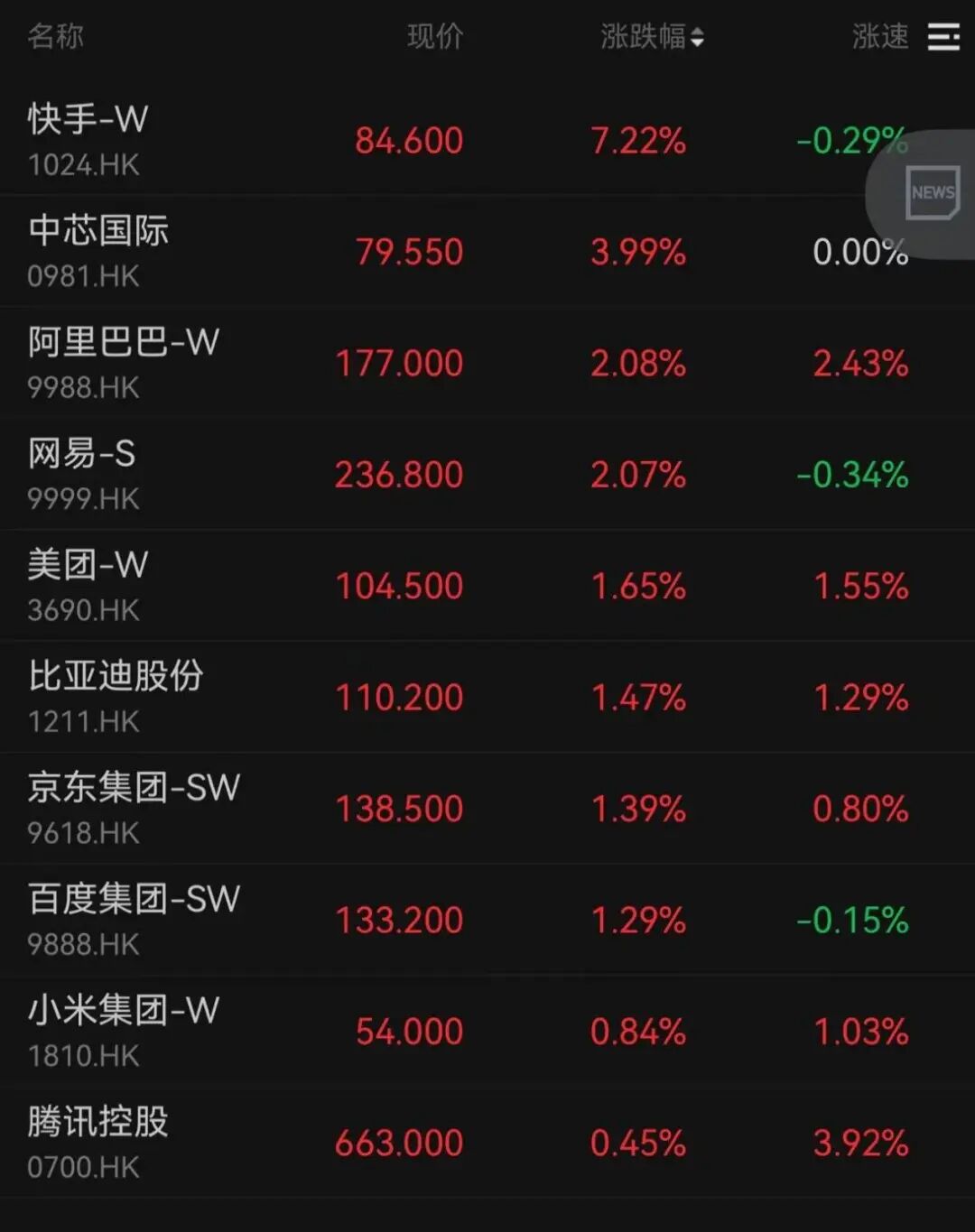 大型科网股再度走强。快手收涨7.22%,股价创下近三年新高。阿里巴巴、网易涨幅在2%以上,美团、京东集团、百度集团涨超1%。